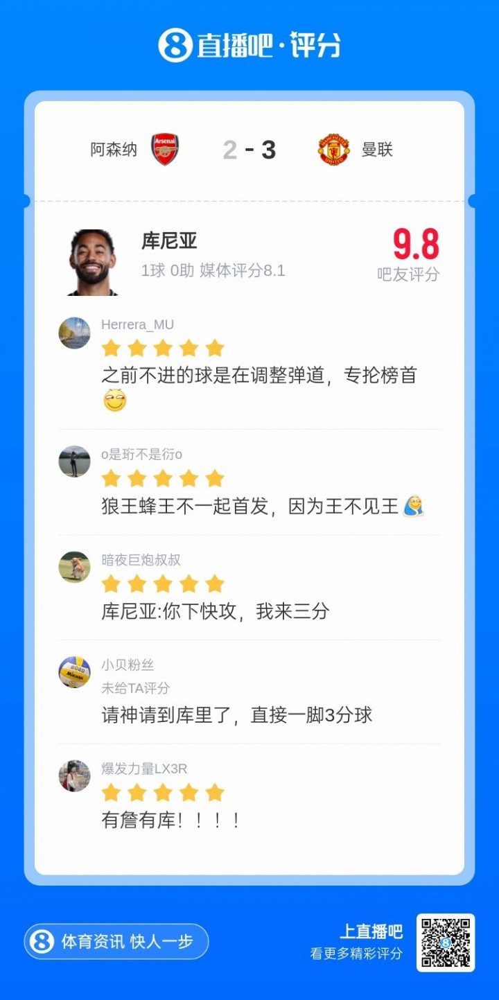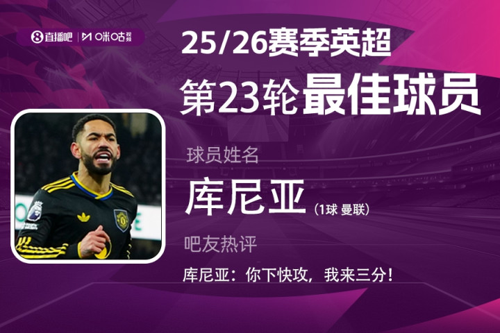 2025-2026赛季英超火热进行中,直播吧和咪咕体育联合发起每轮英超最佳球员评选活动!第23轮评选结果已经出炉,曼联前场球员库尼亚当选!