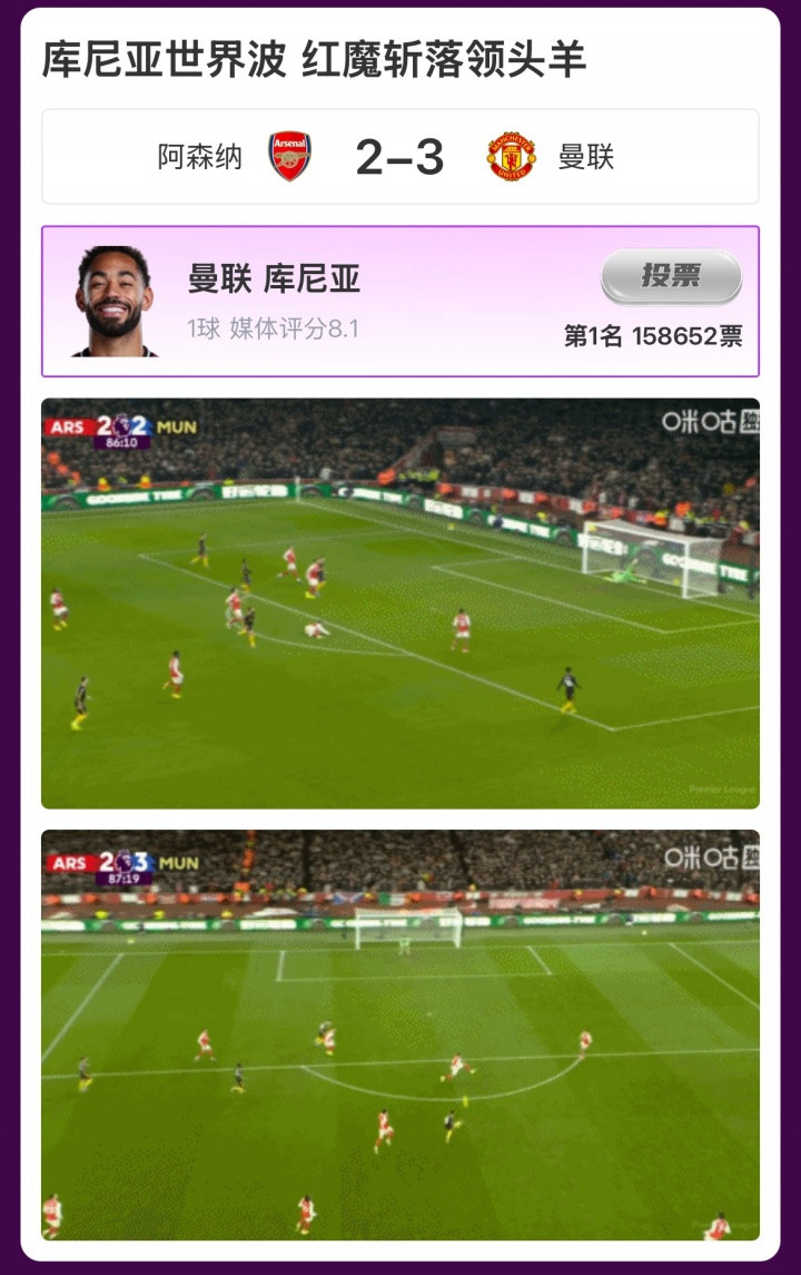 本轮焦点战曼联客场应战 3-2力克领头羊阿森纳,后备 登场的库尼亚轰出世界波,在阿森纳扳平3分钟后再次将比分超出,并保持到了完场。